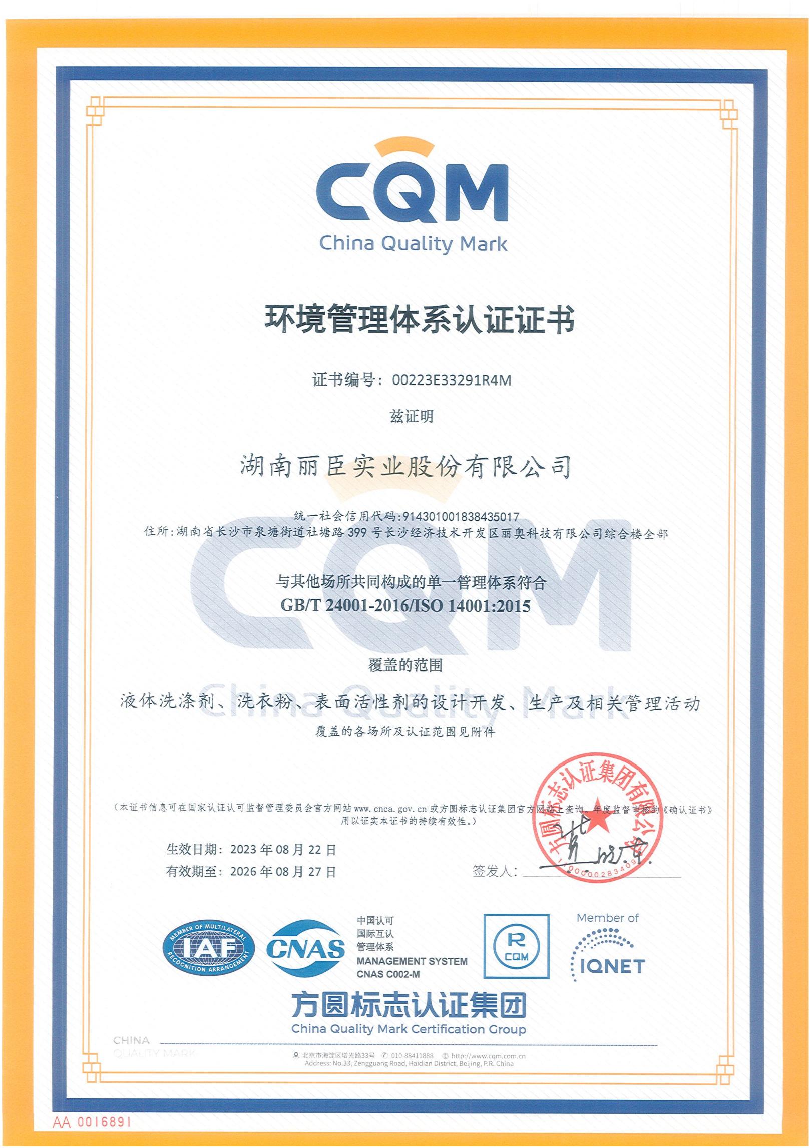湖南麗臣環(huán)境管理體系認(rèn)證證書